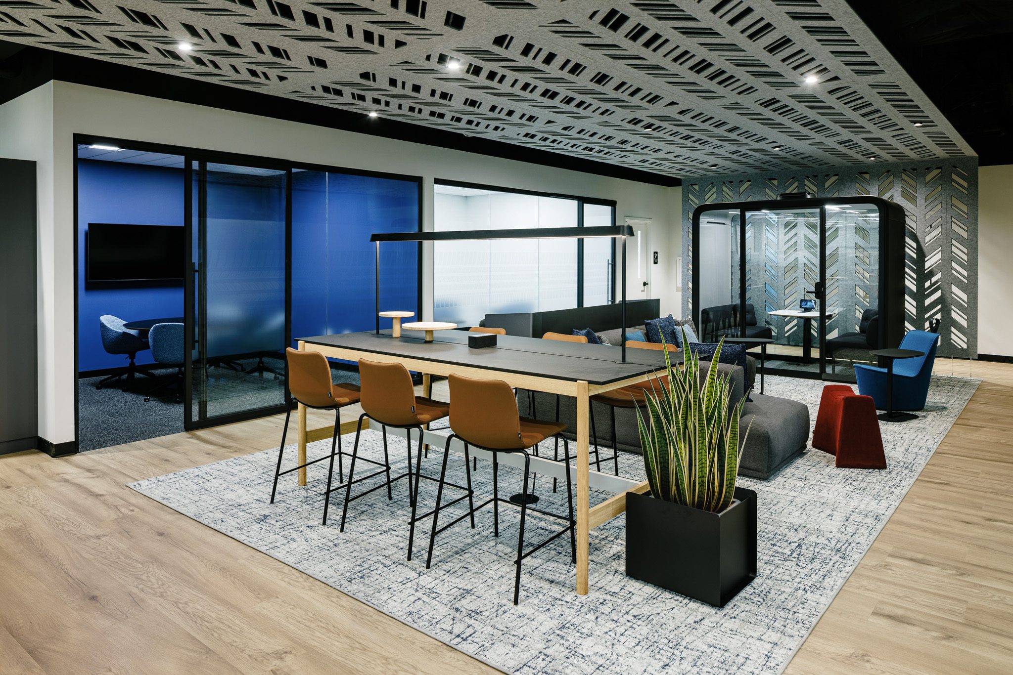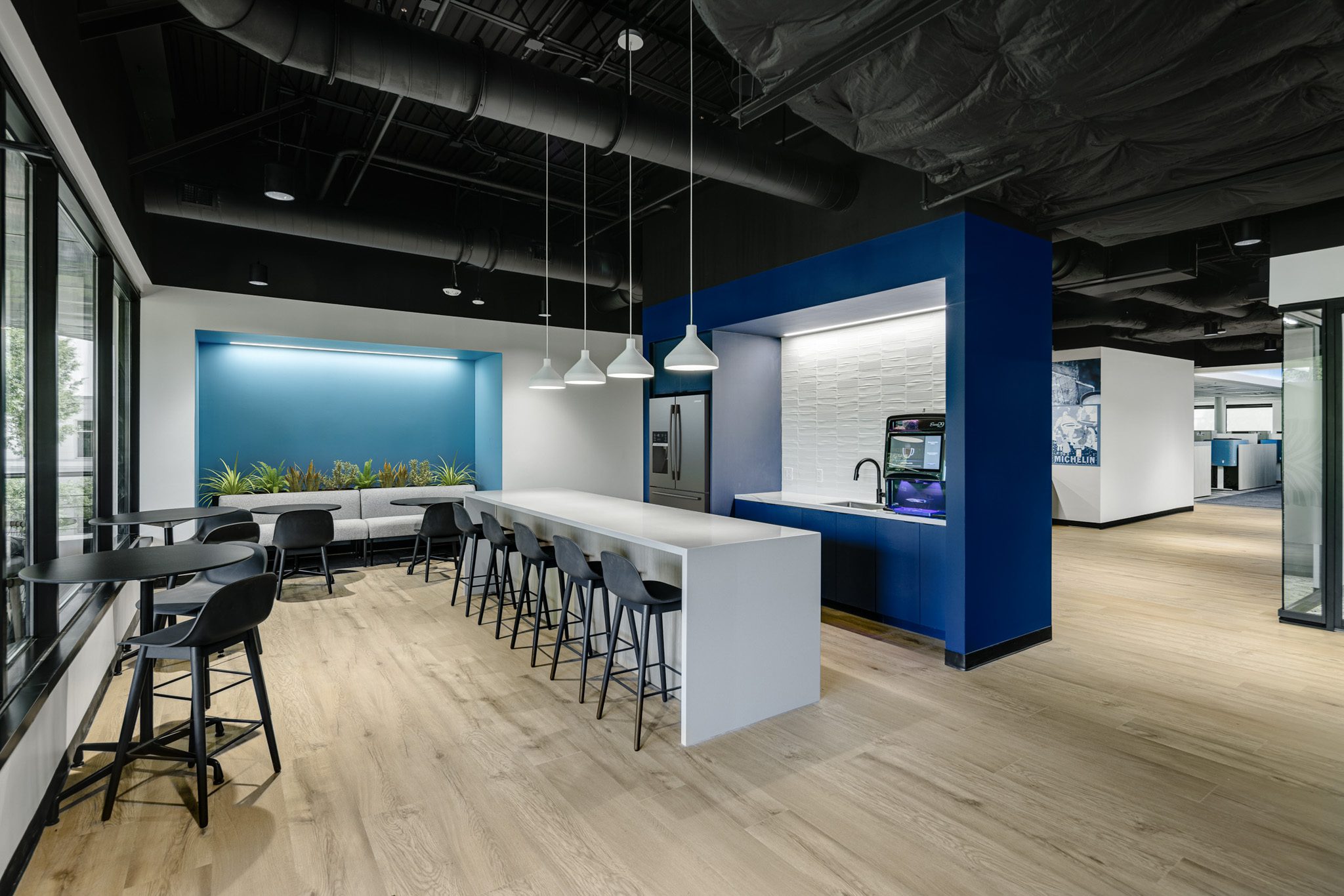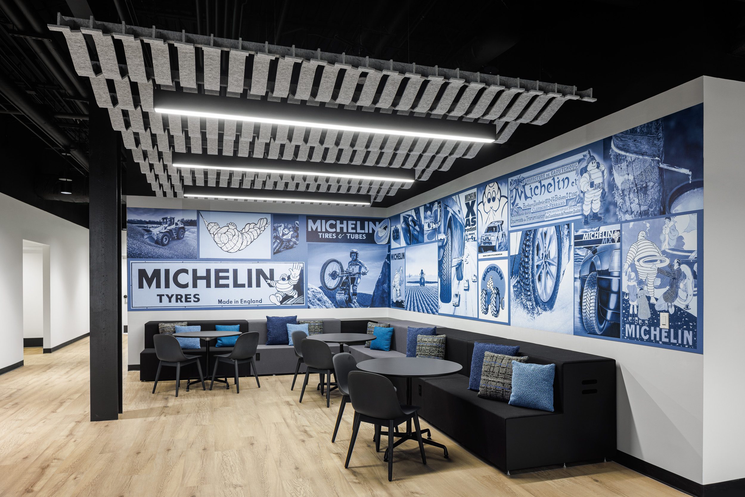 This corporate space for Michelin takes a bolder, moodier approach while still prioritizing employee well-being and connection. Subtle design nods to Michelin’s tire heritage are thoughtfully woven throughout the interiors, adding texture and a tie to branding without overwhelming the design. Inside, employees can choose from a wide range of collaboration spaces – from traditional meeting rooms to relaxed lounge settings and cozy built-in book nooks – ensuring everyone can find the right environment for their work style. With the addition of inviting outdoor areas, this building also embraces fresh air and open space as part of the daily experience. The result is a flexible, inspiring workplace that balances brand identity, comfort, and creativity.