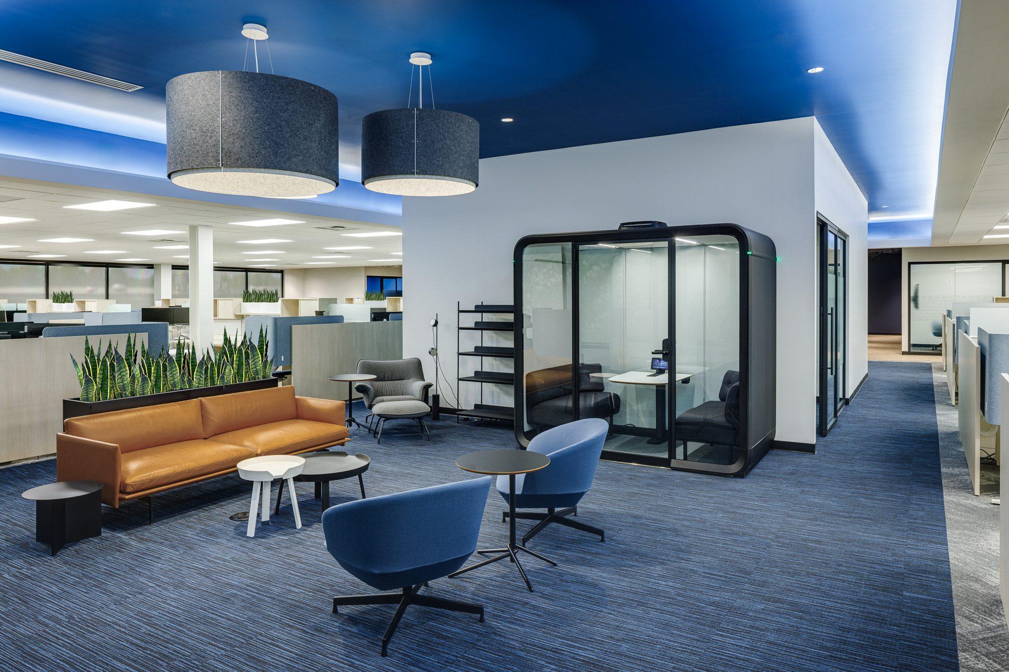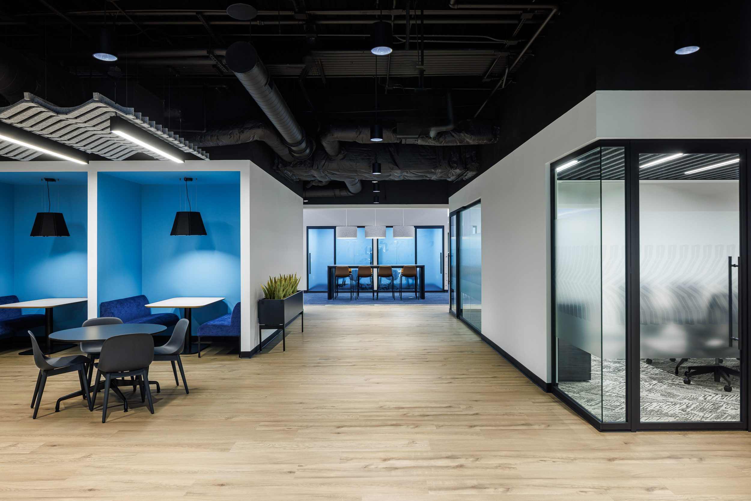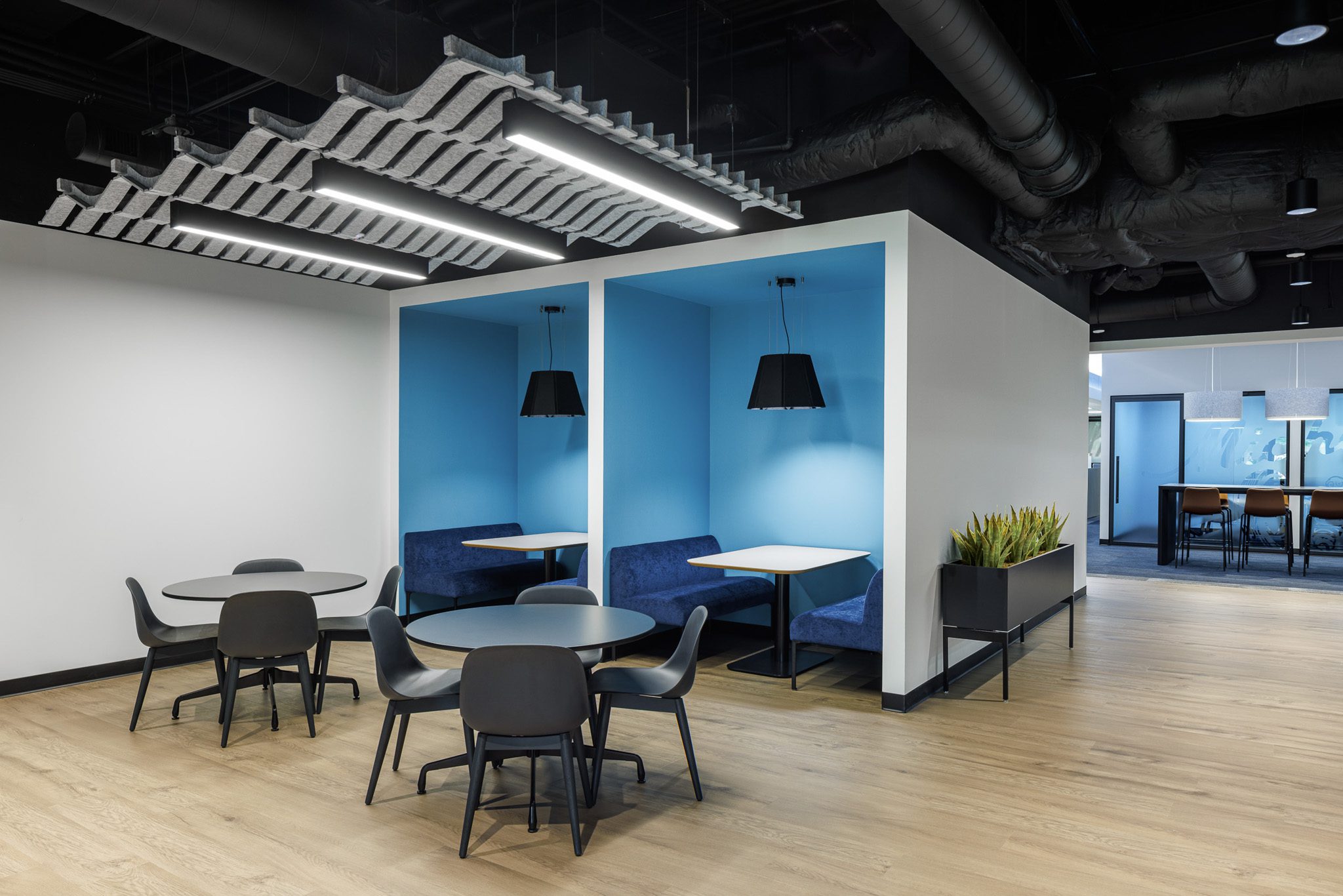 This corporate space for Michelin takes a bolder, moodier approach while still prioritizing employee well-being and connection. Subtle design nods to Michelin’s tire heritage are thoughtfully woven throughout the interiors, adding texture and a tie to branding without overwhelming the design. Inside, employees can choose from a wide range of collaboration spaces – from traditional meeting rooms to relaxed lounge settings and cozy built-in book nooks – ensuring everyone can find the right environment for their work style. With the addition of inviting outdoor areas, this building also embraces fresh air and open space as part of the daily experience. The result is a flexible, inspiring workplace that balances brand identity, comfort, and creativity.